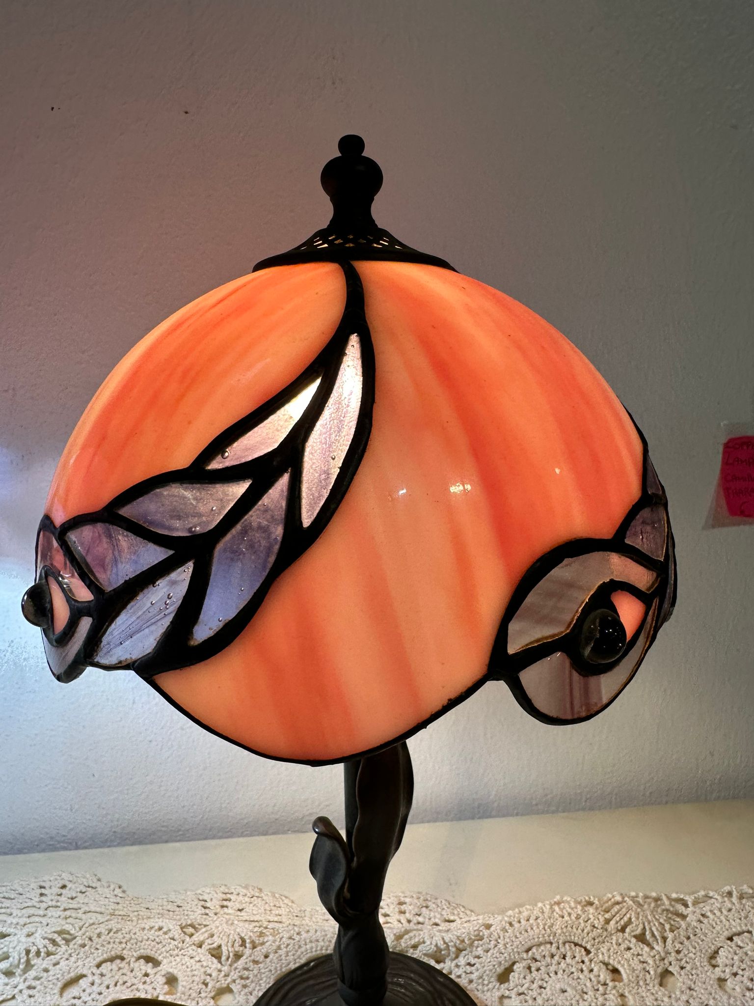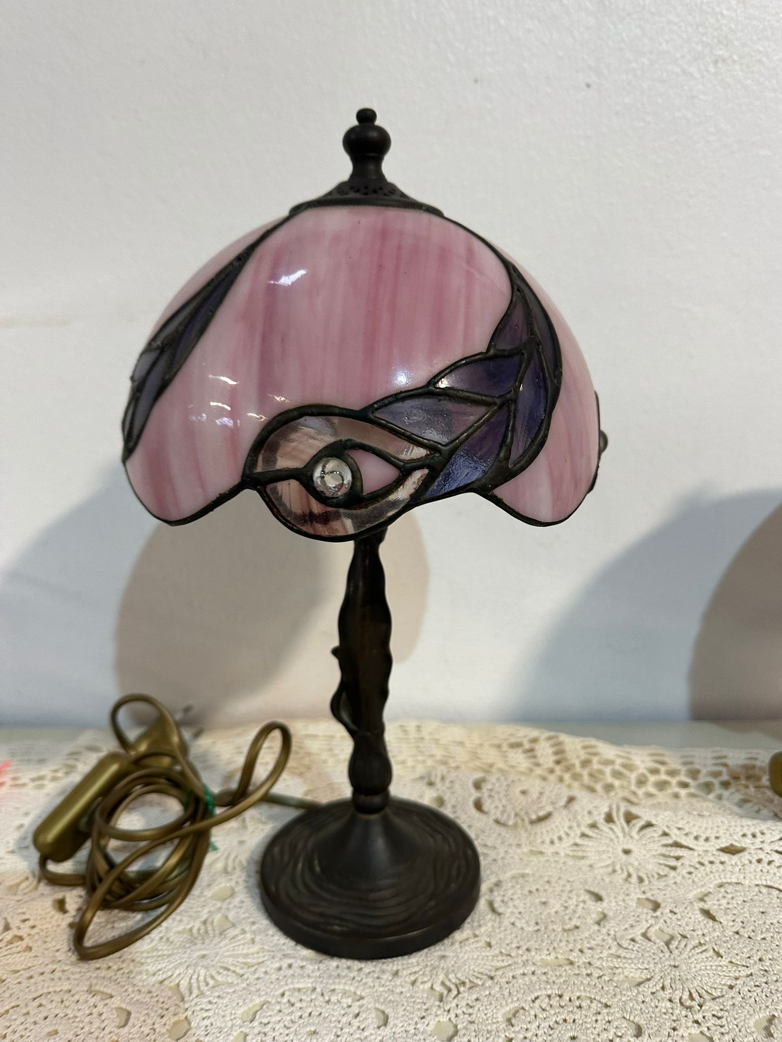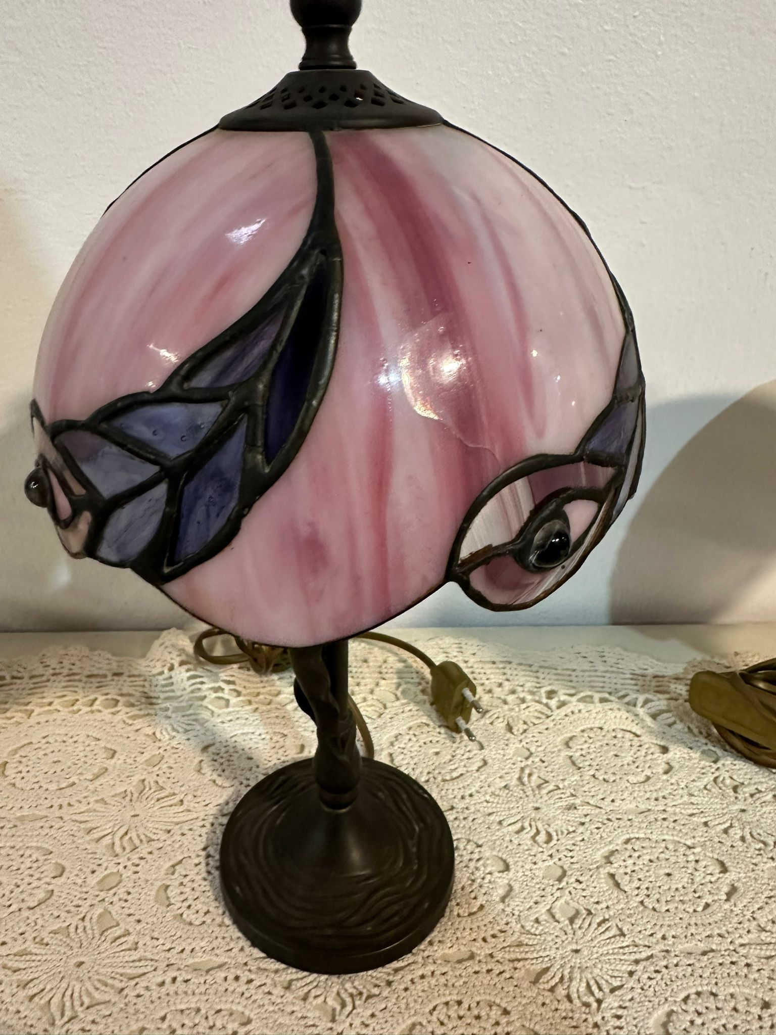 Coppia di Lampade da Tavolo Tulipano – Design Vintage anni ’70/’80 Descrizione: Elegante coppia di lampade con diffusori in vetro soffiato a forma di tulipano. Le sfumature dal rosa all’arancio creano una luce calda e accogliente. Struttura in metallo brunito d’ispirazione Liberty.