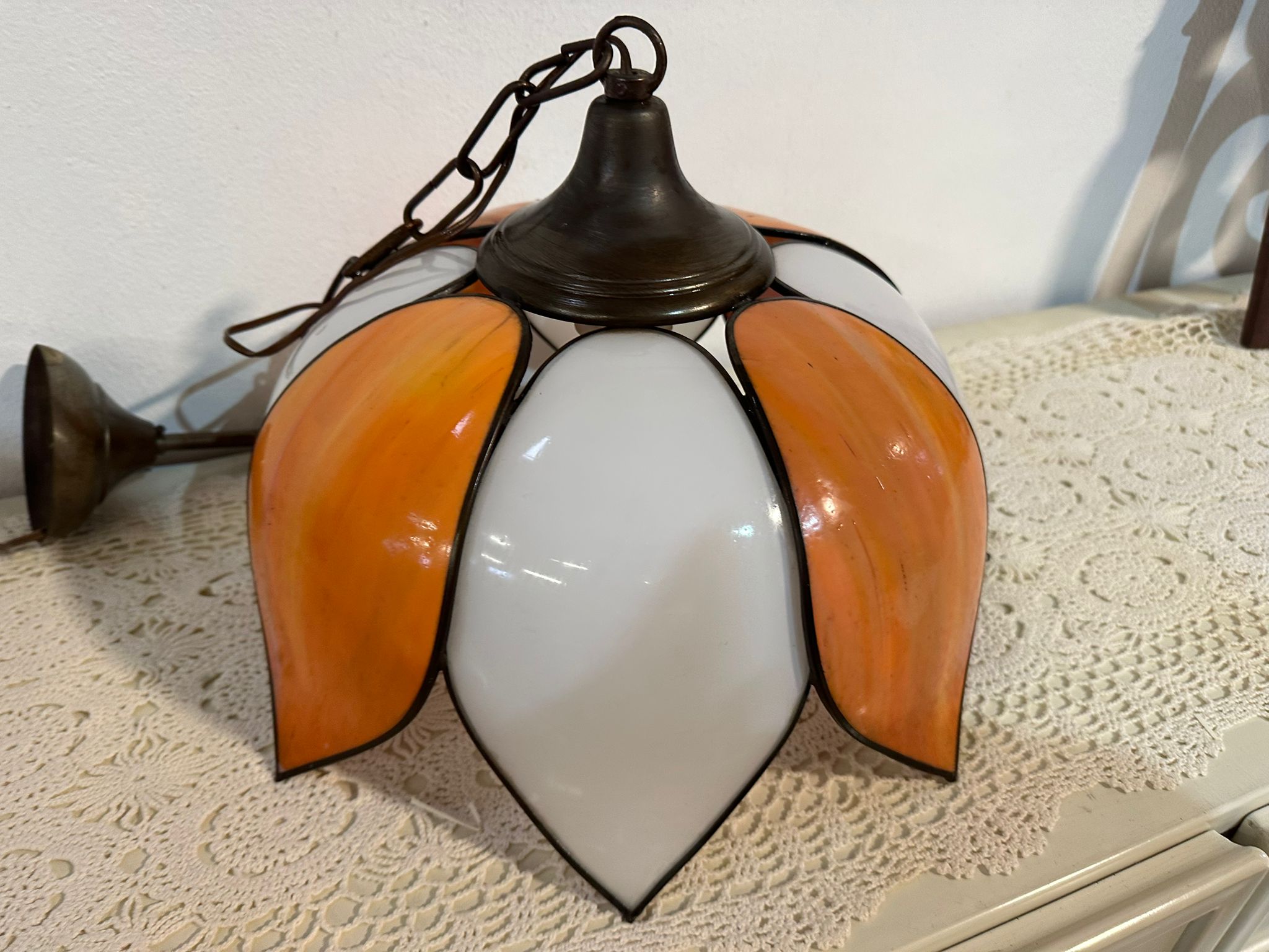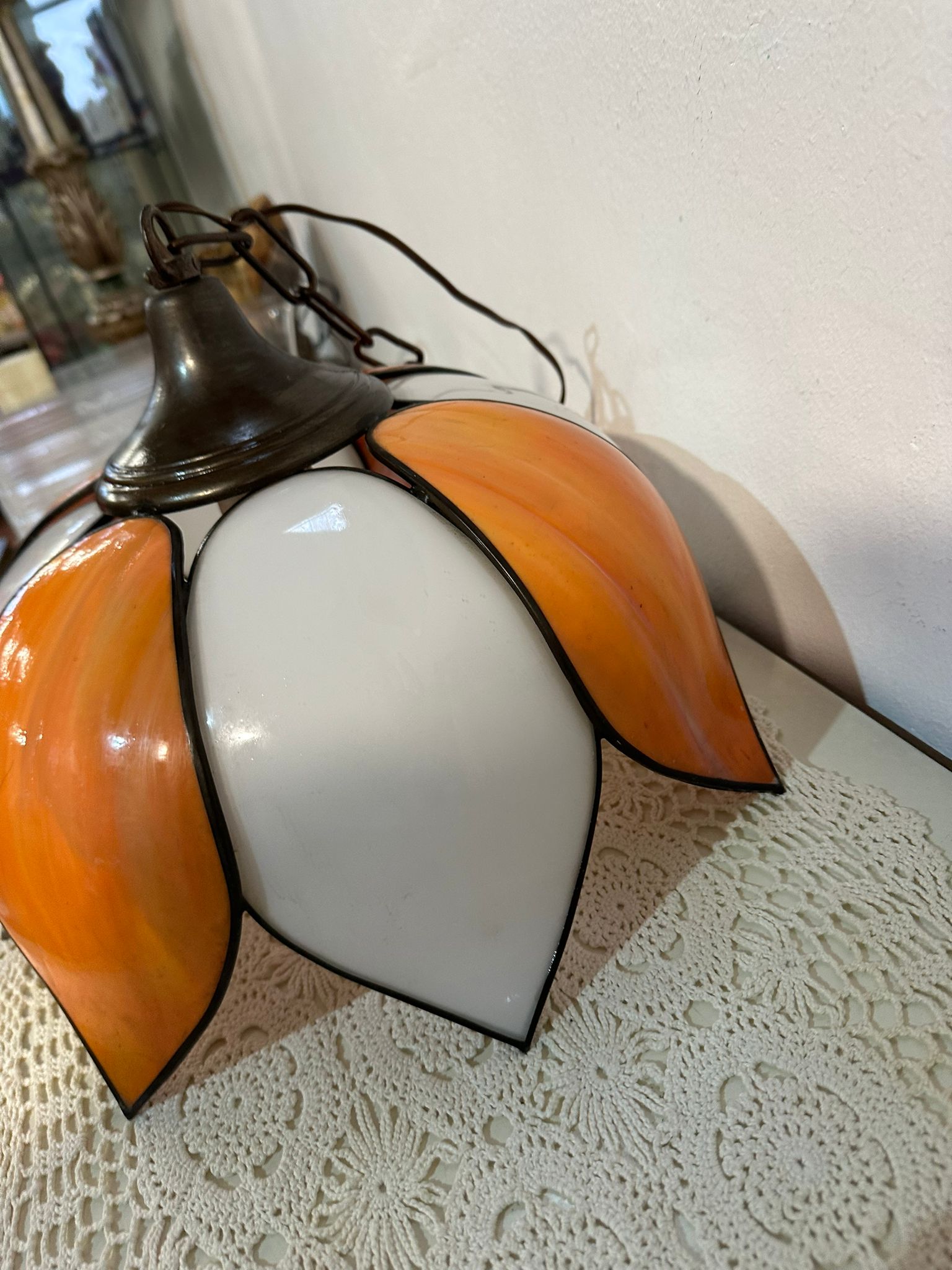 egante abat-jour d’epoca ispirata ai celebri design di Louis Comfort Tiffany. La lampada si distingue per il raffinato paralume in vetro opalino sagomato a forma di tulipano, con delicate sfumature cromatiche che sfumano dal bianco candido al rosa intenso e viola.